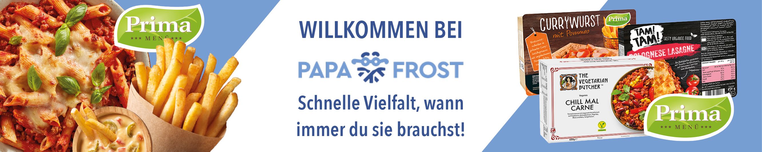 Entdecke bei Papafrost die ganze Welt der Tiefkühlprodukte. Egal ob köstliche Fertiggerichte, zarte Steaks, edler Fisch oder knackiges Gemüse – wir liefern dir Qualität, die schmeckt und überzeugt. Unsere Produkte werden nachhaltig verpackt und kommen in perfektem Zustand bei dir an. Bestelle bequem online und genieße den Komfort unseres TK NextDay Express Versands.